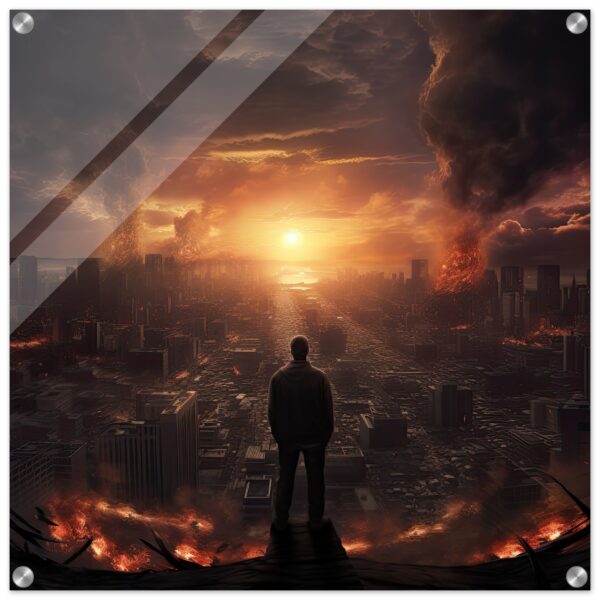 A lone man stands overlooking a ruined, post-apocalyptic city with fires raging and destroyed building littering the background. A stunning digital art acrylic print of the apocalypse… as the world ends.