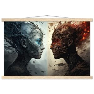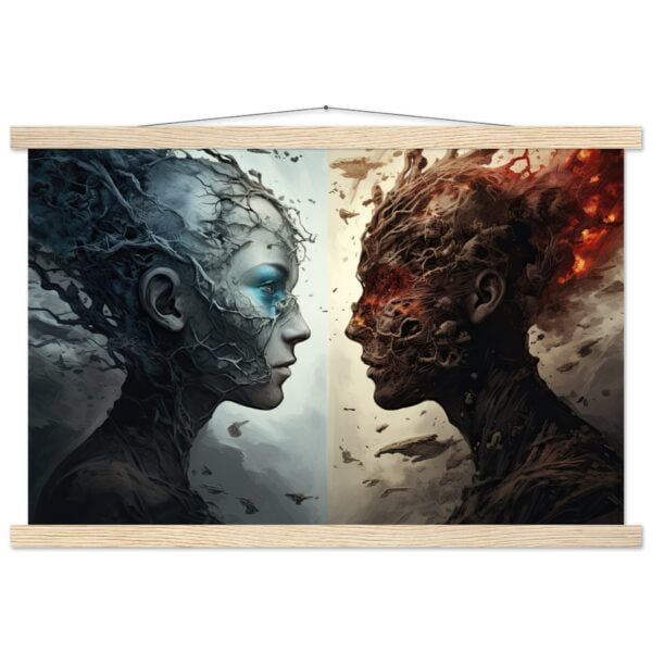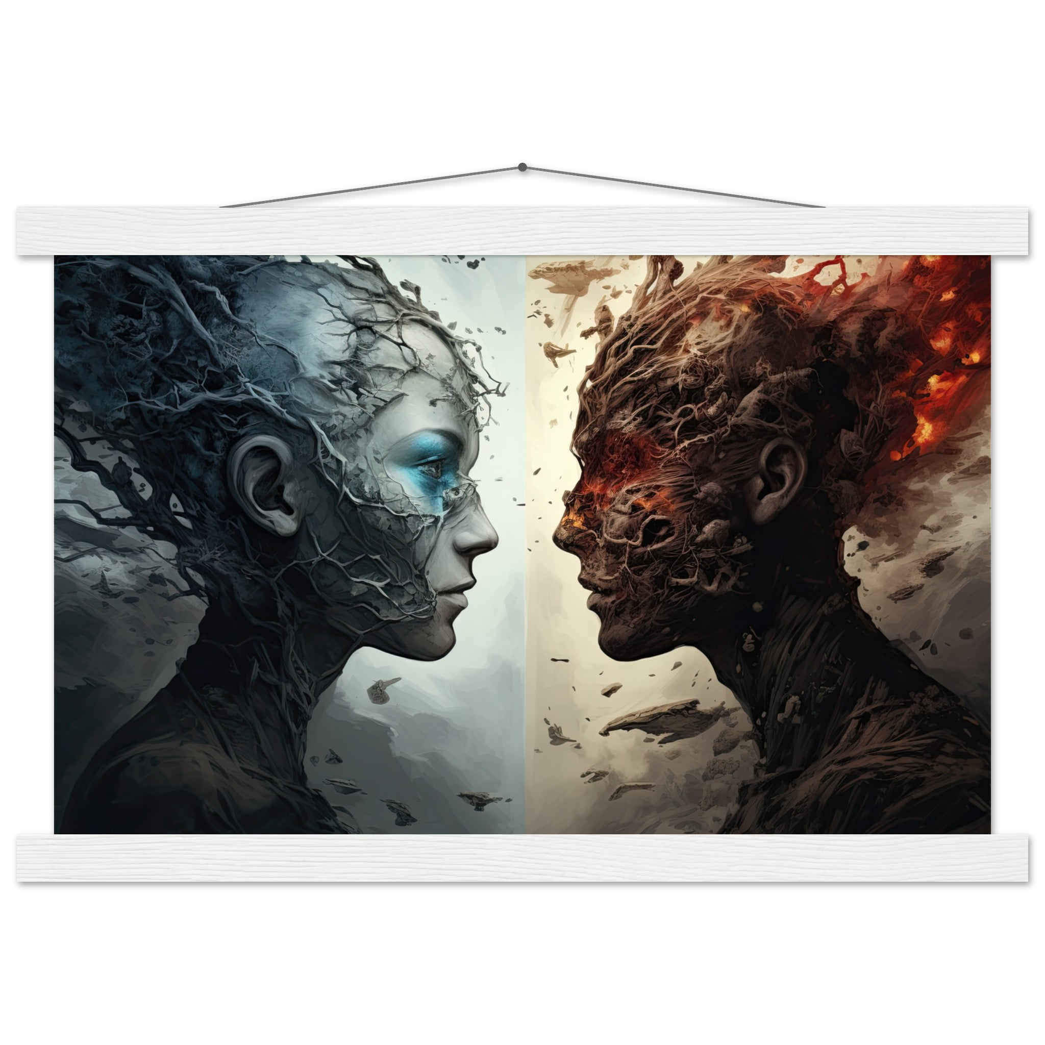 A thought-provoking digital art illustration that explores the concept of duality and inner conflicts. This hanging art print shows the contrasting elements of fire and ice, and light and darkness, symbolizing the complex nature of human existence.