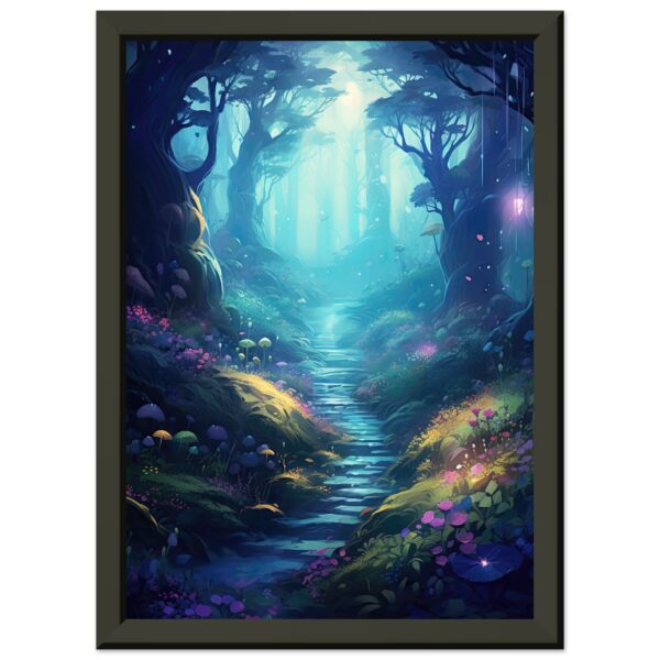 A beautiful digital art framed print of a lovely pathway through a magic forest at dawn. Purple flowers and lights fill the path as the morning light peaks through and brightens the wonderous background.