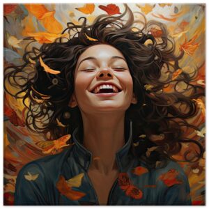 A painted style canvas print featuring a girl with expressions of pure joy and happiness while leaves, colors, and butterflies surround the background. A beautiful artwork that evokes the same feelings of joy in the viewer.