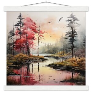 A stunning watercolor style landscape art hanging print showing a beautiful autumn lake sunset and lush red trees. The breathtaking colors reflect on the water of the lake while birds fly through the sky.