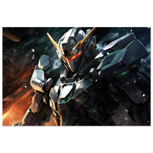 A cool anime mecha style art metal print depicting a colossal robot mech with a stunning sci-fi and futuristic design. Its sleek, polished metal frame glistens under the muted rays of a setting sun, while intricate details reveal the scars of countless battles.